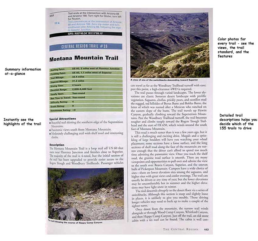 Arizona Trails Central RegionFull color regional guidebooks with complete details of 763 miles of trails around Phoenix, Wickenburg, Quartzite, Superior, Globe, and Yuma. GPS coordinates, ratings, descriptions and histories for all trails.